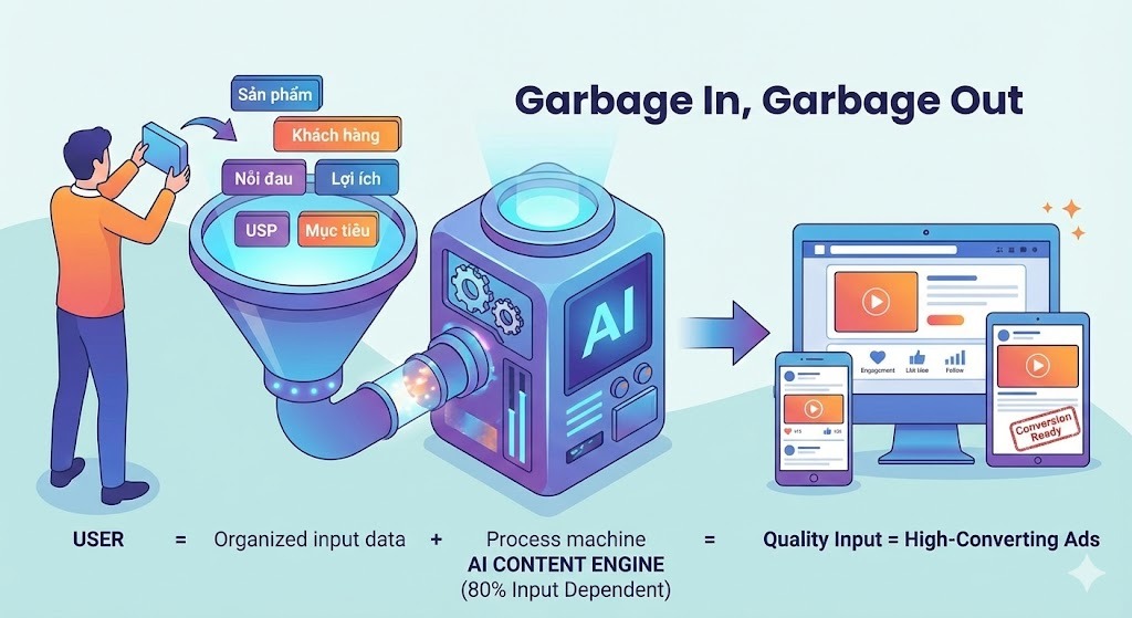 Đây là yếu tố quyết định lớn nhất. AI viết content chạy ads hay hay dở phụ thuộc vào chất lượng thông tin bạn cung cấp. Bạn nên mô tả rõ ràng sản phẩm, lợi ích, khách hàng mục tiêu, nỗi đau khách đang gặp, mong muốn khi mua hàng, điểm khác biệt của bạn so với đối thủ và mục tiêu của chiến dịch. Càng rõ bao nhiêu, AI càng viết đúng insight bấy nhiêu. AI viết hay hay dở phụ thuộc 80% vào thông tin bạn đưa vào. Bạn cần đưa vào AI: