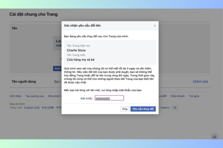 - Bước 7: Cuối cùng nhấn “Gửi yêu cầu” để hoàn thành quy trình đổi tên Fanpage.