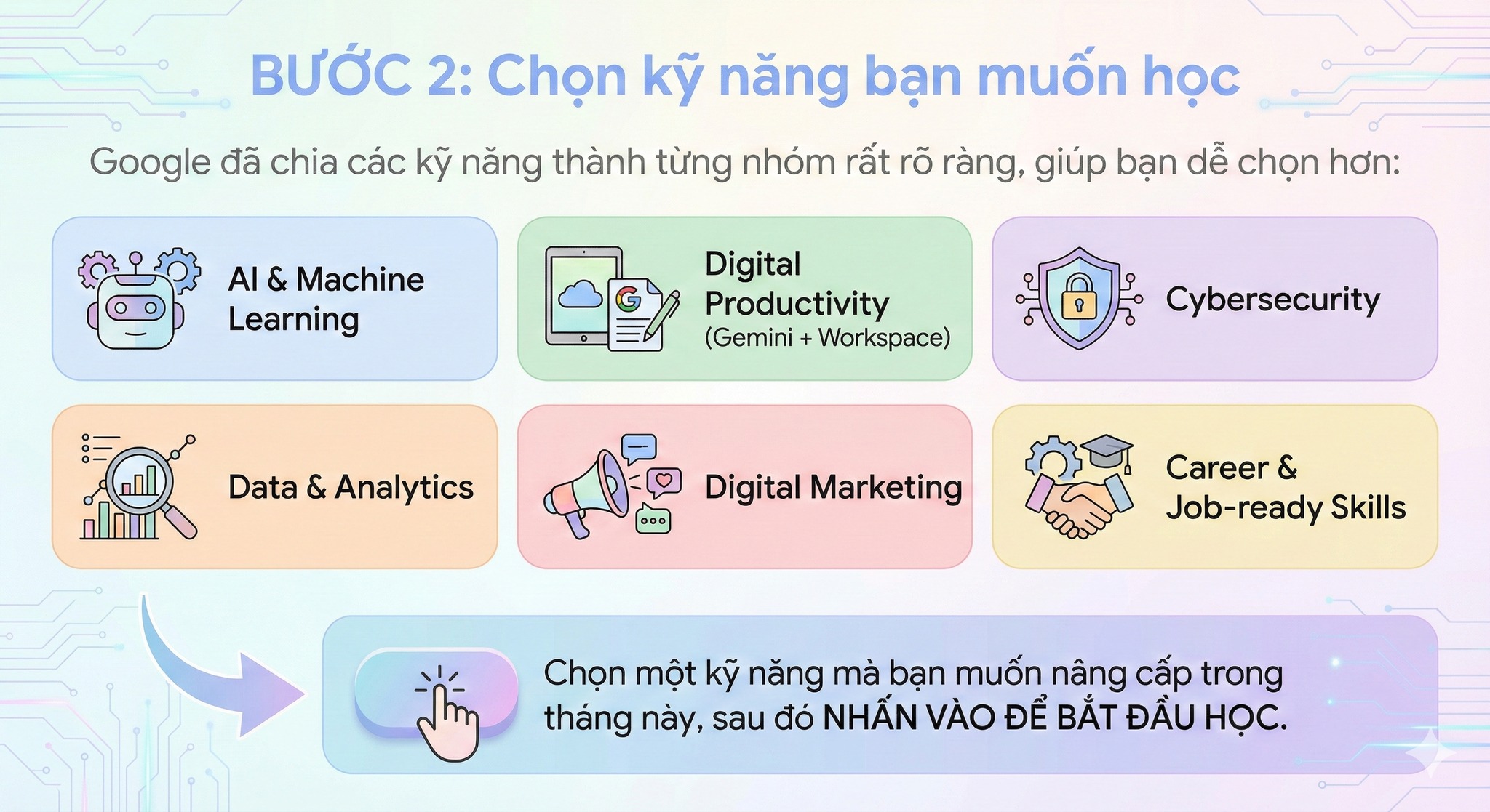 Digital Productivity (Gemini + Google Workspace): Tập trung vào việc ứng dụng AI Gemini để tăng năng suất làm việc hằng ngày