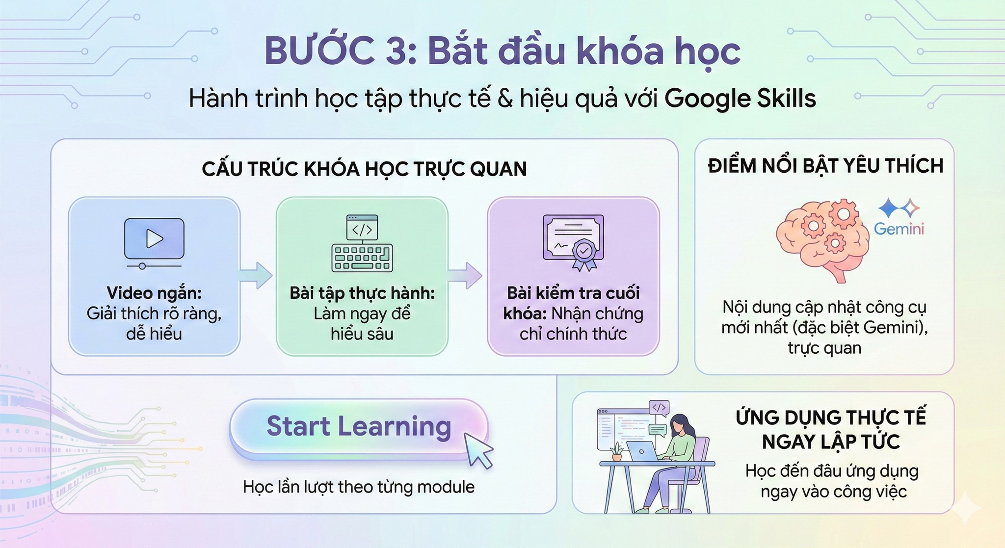 Các khóa học trên Google Skills được thiết kế trực quan, dễ tiếp cận và có thể học ngay cả khi bạn chưa có nền tảng công nghệ.