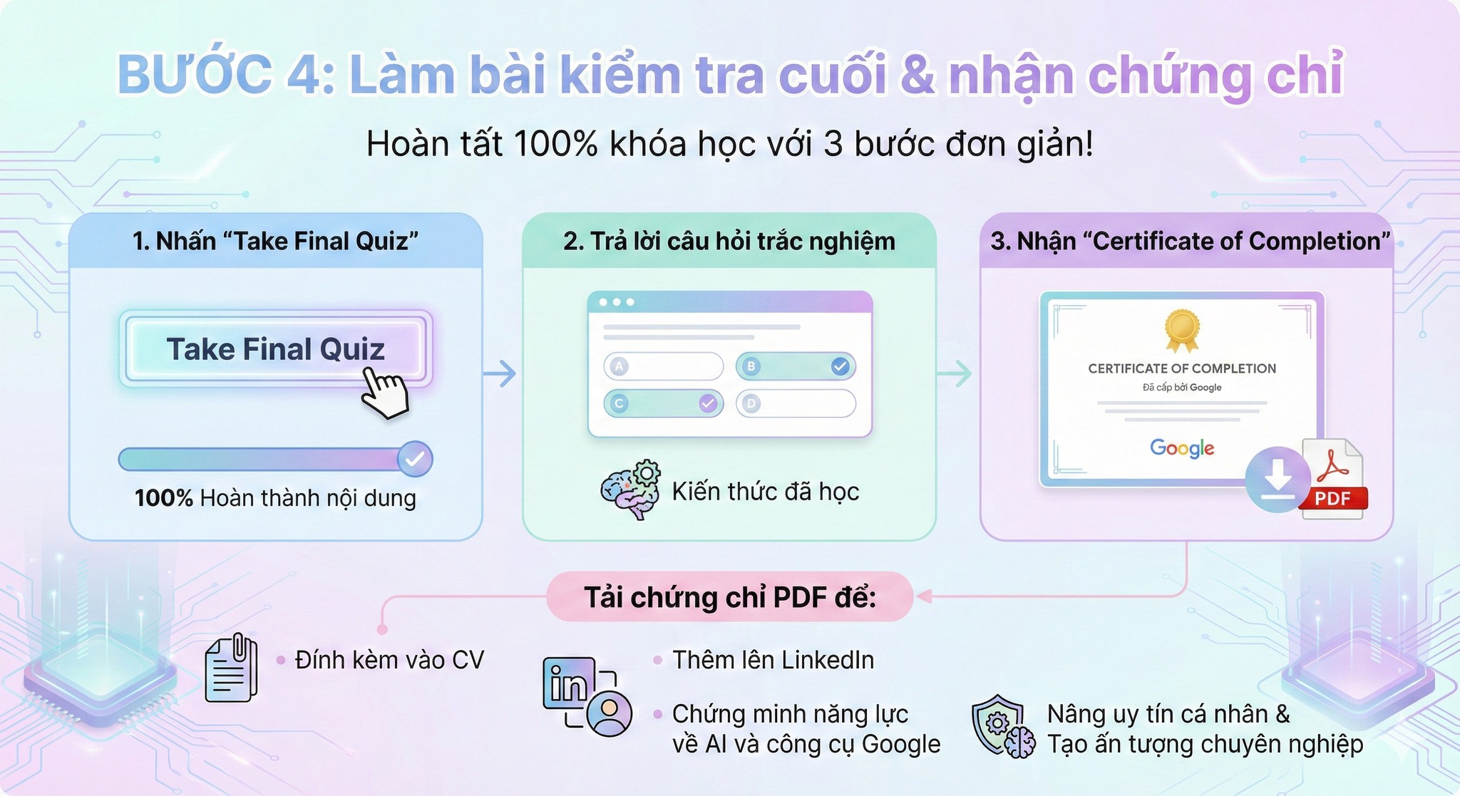 Sau khi hoàn thành, Google sẽ cấp Certificate of Completion để bạn tải về dưới dạng PDF.